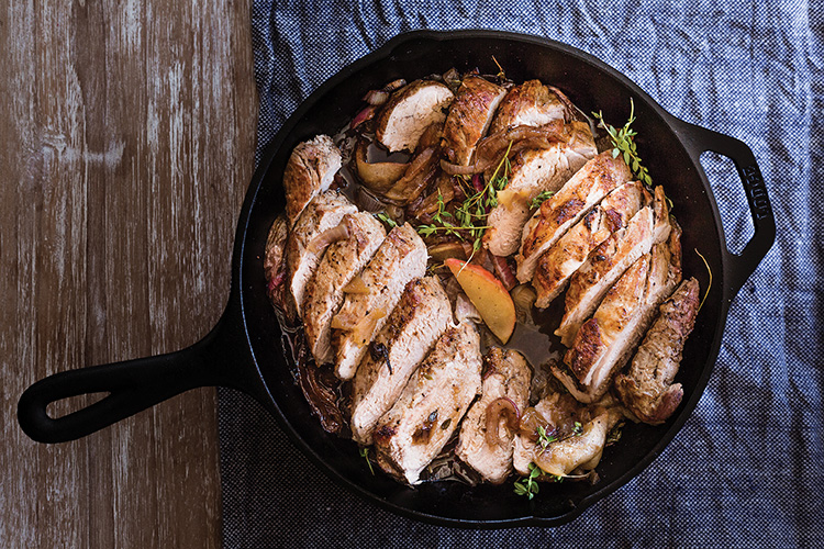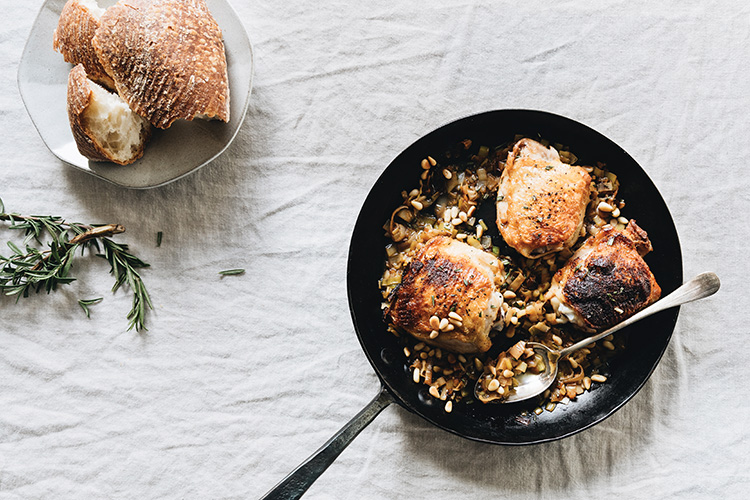 Skillet Chicken Thighs with Caramelized Leeks, Preserved Lemon, and White Wine