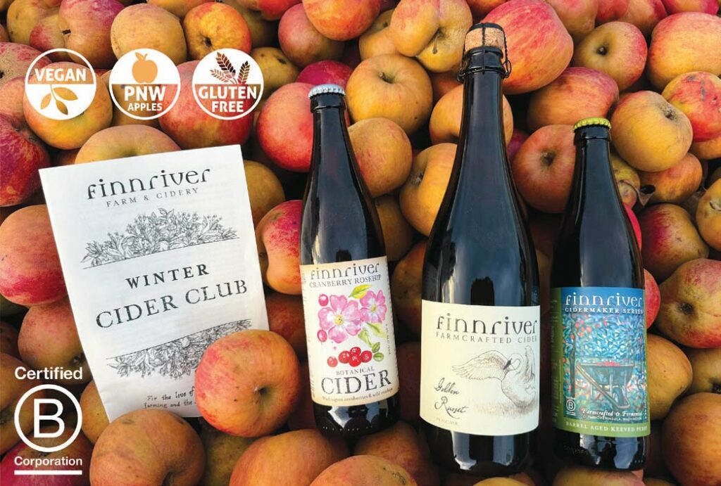 Finnriver is a certified organic orchard, Salmon Safe Farm and B Corp on Washington’s beautiful Olympic Peninsula. We grow and source organic, wildharvested and seasonal ingredients for our ciders. Give the gift of farm-crafted cider and choose between our 3-, 6-, or 12-bottle quarterly club. It’s FREE to join and members enjoy year-round discounts, access to exclusive small-batch releases, and 50% off Tasting Tours at our organic farm.